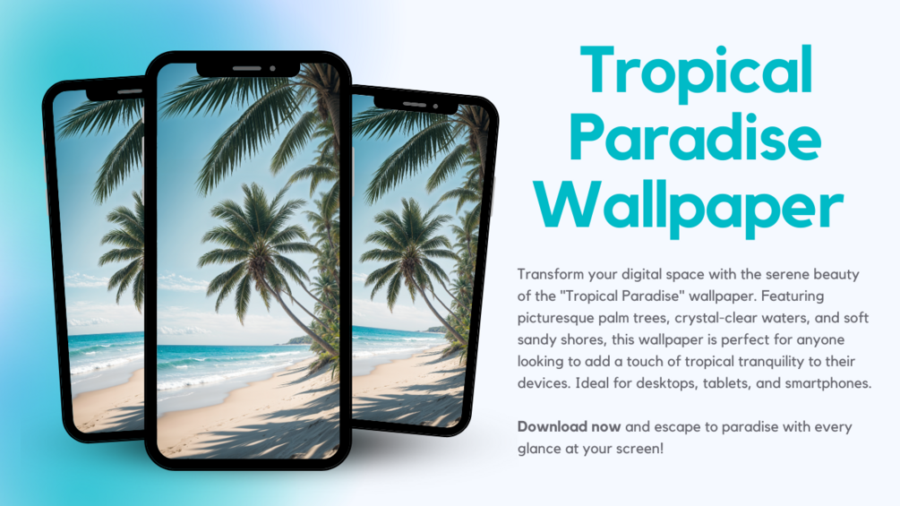 Immerse yourself in the tranquility of a serene tropical beach with the "Tropical Paradise" wallpaper. This stunning image captures the essence of a perfect beach day, featuring swaying palm trees, crystal-clear blue waters, and soft sandy shores. Perfect for bringing a touch of paradise to your digital space, this wallpaper is ideal for desktops, tablets, and smartphones.